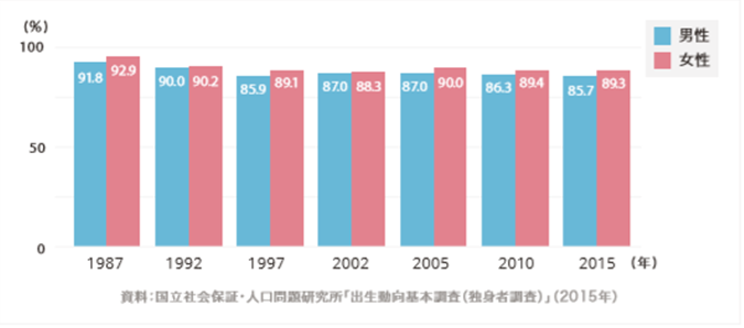 こちらが結婚する意志のある男女の割合を調査したデータです。婚姻率が低下しているにもかかわらず、男性、女性の「結婚したい」想いは、80~90%と高いことがわかります。