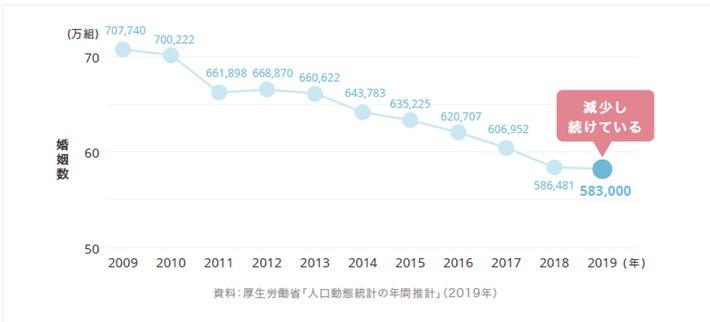 年間の婚姻率は、2010年70万組が婚姻しておりましたが、2019年には58万組と年々減少傾向にあることがわかります。