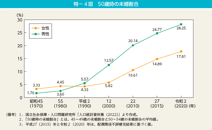 内閣府男女共同参画局によると、2020年の50歳男性の未婚割合は28.25%、50歳女性では17.81%が結婚を経験していないとの調査結果が報告されています。